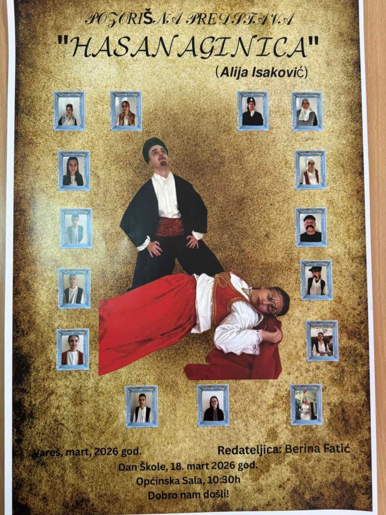 U 10:30 sati, u općinskoj sali Vareš, bit će izvedena pozorišna predstava „Hasanaginica“, rađena prema tekstu Alije Isakovića. Ova bezvremenska drama o ljubavi, ponosu i tragičnoj sudbini žene u tradicionalnom društvu oživjet će na pozornici u izvedbi talentiranih glumaca pod redateljskom palicom Berine Fatić.