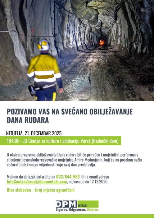 Iz kompanije DPM Metali pozivaju sve građane Vareša da učestvuju u obilježavanju Dana rudara, dana koji slavi snagu, hrabrost i zajedništvo rudara,  ljudi koji su obilježili prošlost i oblikuju budućnost našeg kraja.
