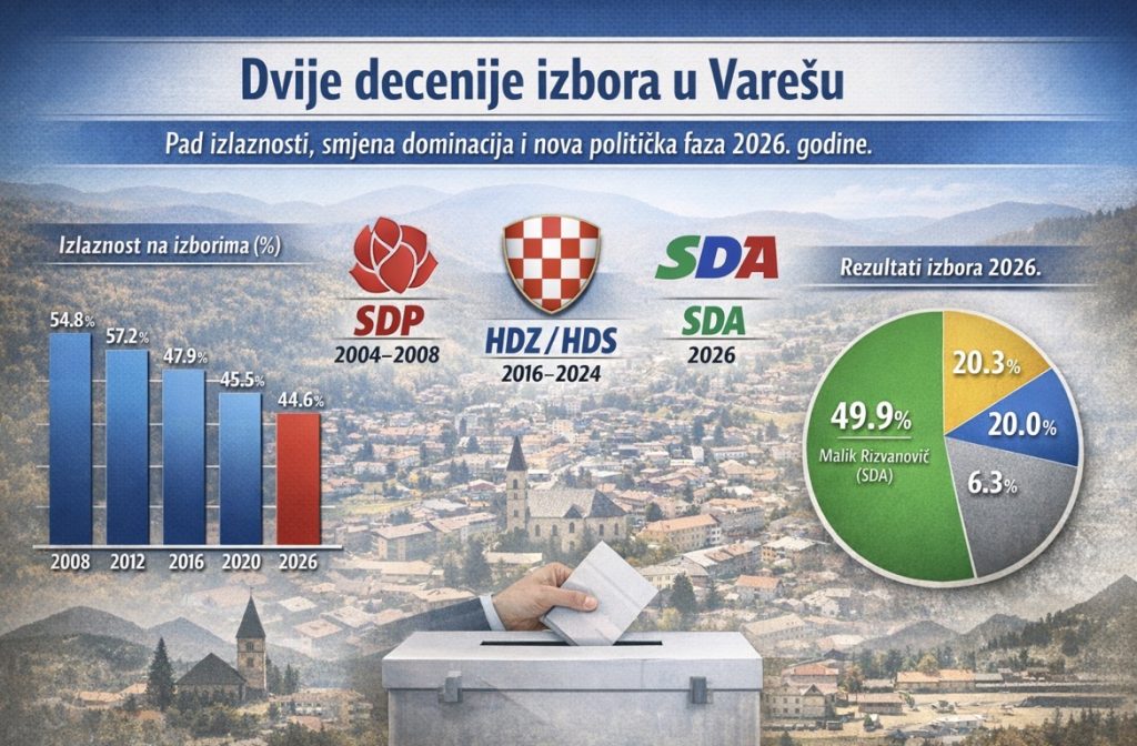 U protekle dvije decenije politička scena u Varešu prošla je kroz nekoliko jasno prepoznatljivih faza, a podaci o izlaznosti i osvojenim glasovima pokazuju i dublje društvene trendove prije svega kontinuiran pad broja birača i smanjenje ukupne političke mobilizacije.