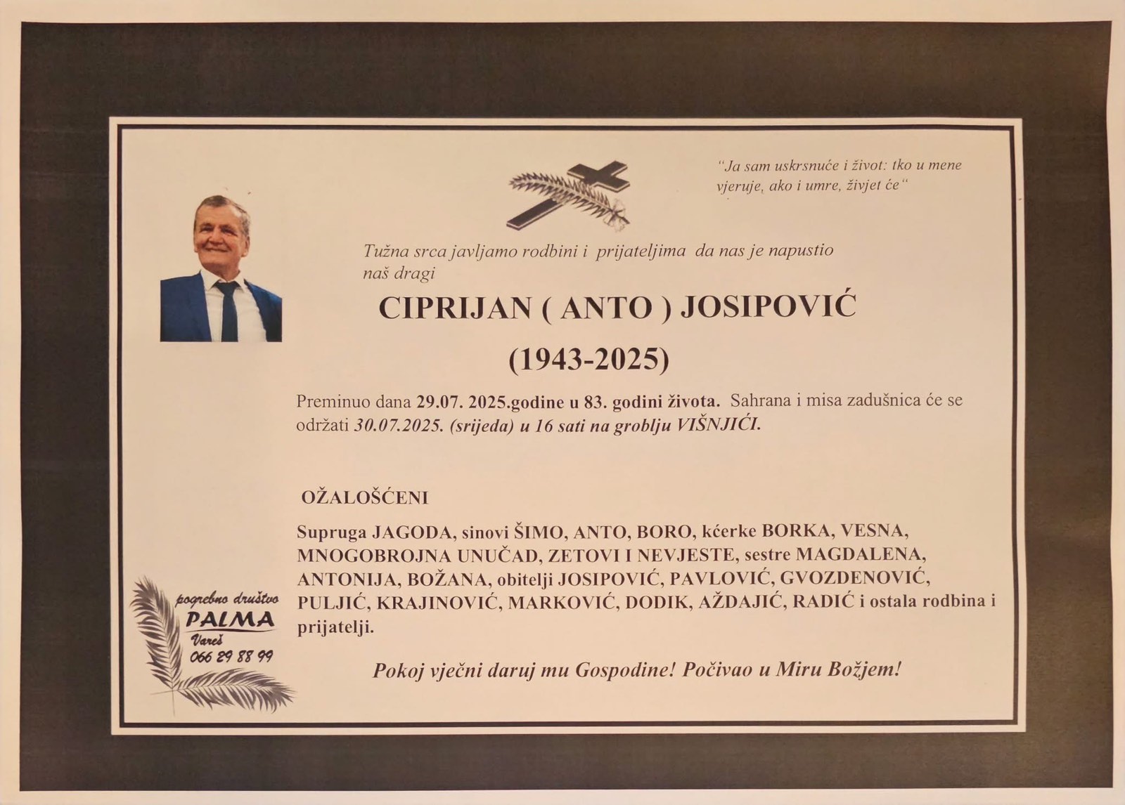 Dijeli Facebook Twitter LinkedIn Pinterest Email WhatsApp Copy Link Sa velikom tugom obavještavamo da je preminuo Ciprijan Josipović u 82. godini života. Sahrana i misa zadušnica će se obaviti u srijedu, 30. jula 2025. godine u 16:00 sati na groblju Višnjići. Porodici i najbližoj rodbini izražavamo iskreno saučešće. In Memoriam