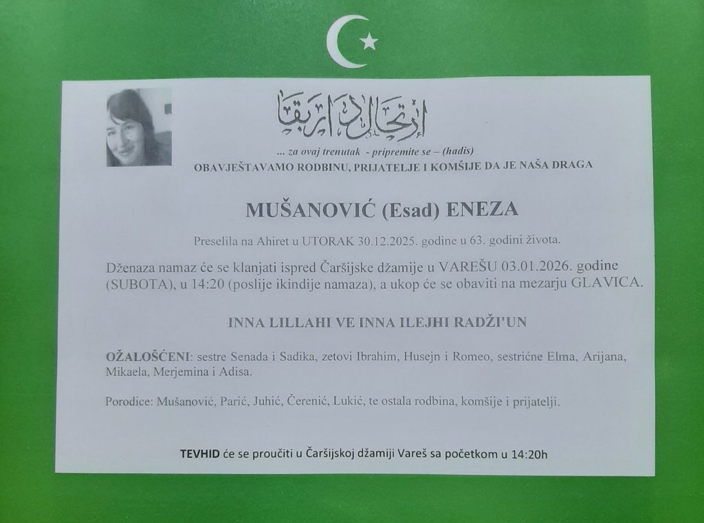 Dženaza namaz će se klanjati ispred Čaršijske džamije u Varešu u subotu, 03. januara 2026. godine, u 14:20 sati, a ukop će se obaviti na mezarju Glavica.