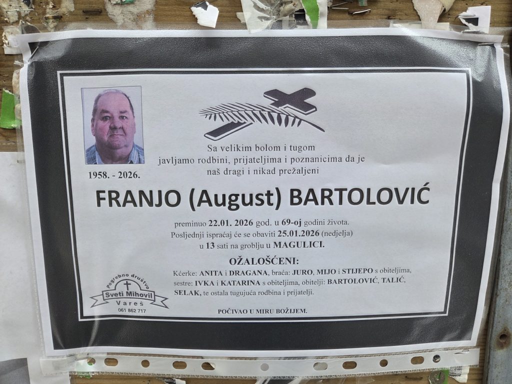 Posljednji ispraćaj će se obaviti u nedjelju, 25. januara 2026. godine u 13:00 sati na groblju u Magulici.
