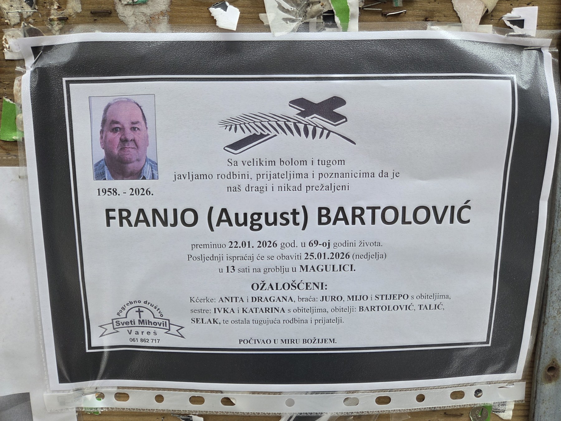Sa velikom tugom obavještavamo da je preminuo Franjo (August) Bartolović u 69. godini života.