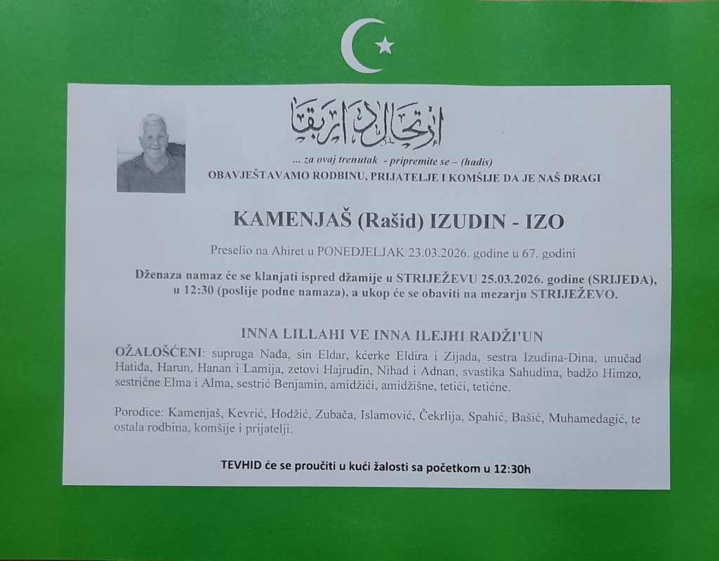 Dženaza namaz će se klanjati u Striježevu, u srijedu 25. marta 2026. godine u 12:30 sati, a ukop će se obaviti na mezarju Striježevo.