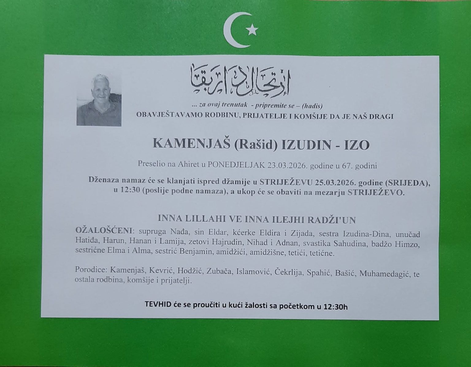 Dženaza namaz će se klanjati u Striježevu, u srijedu 25. marta 2026. godine u 12:30 sati, a ukop će se obaviti na mezarju Striježevo.