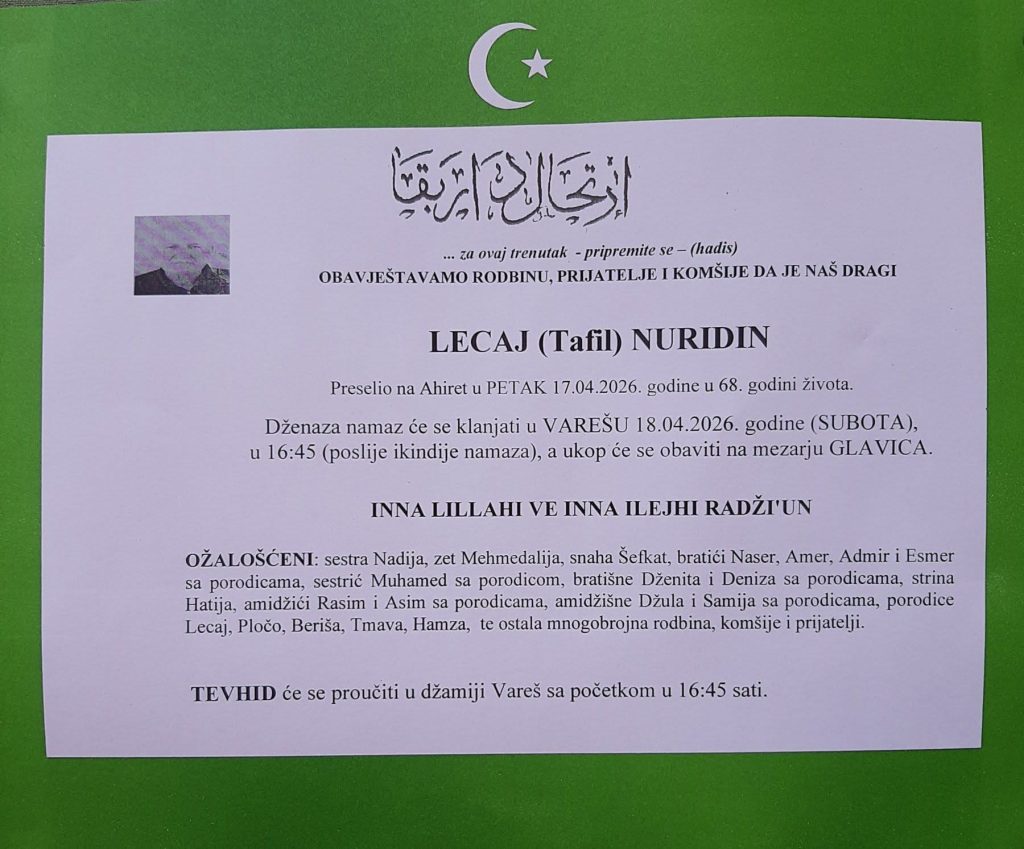 Dženaza namaz će se klanjati u Varešu, u subotu 18. aprila 2026. godine u 16:45 sati, a ukop će se obaviti na mezarju Glavica.