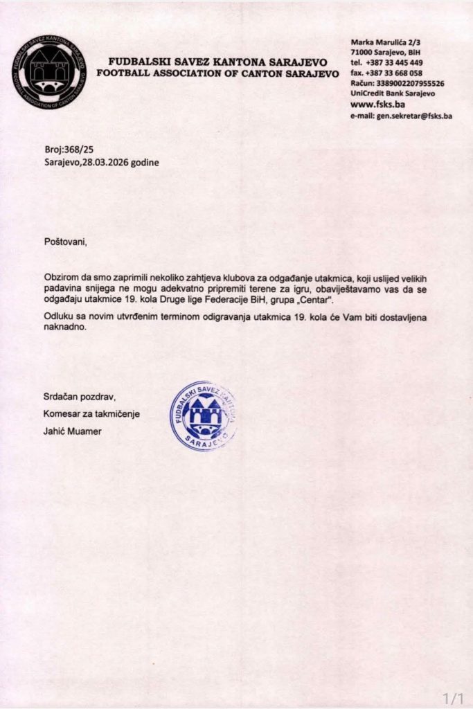 Zbog nepovoljnih vremenskih uslova i obilnih snježnih padavina, Fudbalski savez Kantona Sarajevo donio je odluku o odgađanju utakmica 19. kola Druge lige Federacije Bosne i Hercegovine – grupa „Centar“.